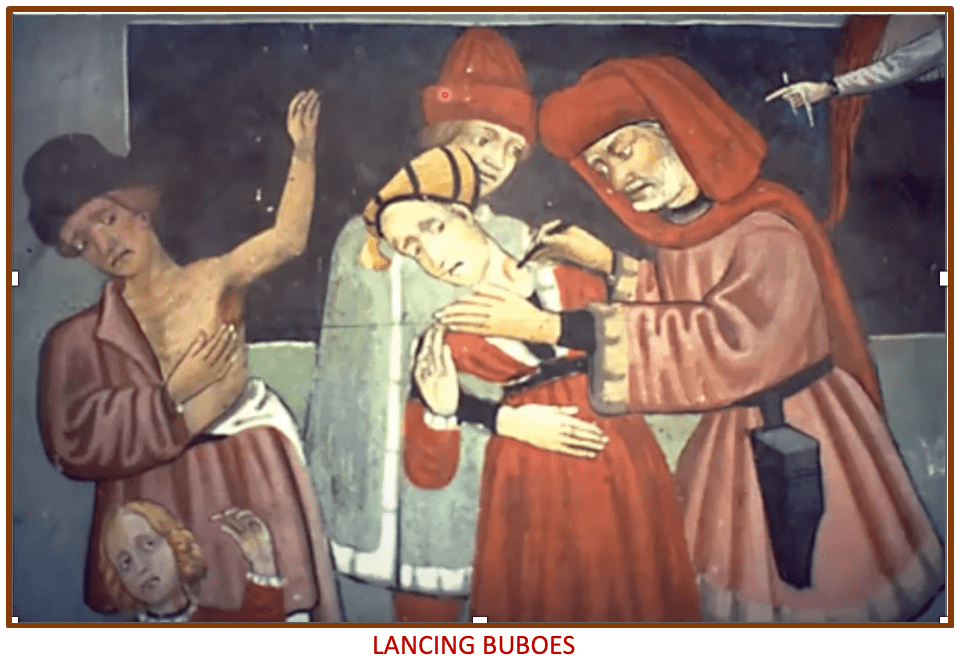 One failed method to combat the disease was to lance the buboes. To rid the body of the pus masses growing under the skin; to drain and shrink the buboes. It didn’t work. The stench from the diseased pus was unbearable. To smell it was to get sick, vomiting without control. Those who performed the intended aid to those afflicted had to wear thick fragrant nose patches or ‘plague masks’ packed with sweet smelling herbs and flowers, to combat the reeking pustule’s leakage from the slicing draw of the surgeon’s lance. And many, many of these same benevolent practitioners that tried to ease the pain by eroding the rages and ravages of the dreaded disease, exposed themselves to all the dangers, and often became infected, and died.