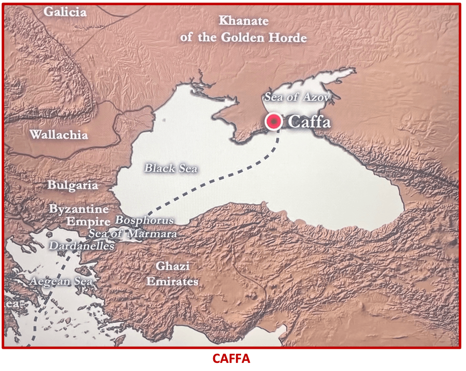 The origin of The Black Death found its locus in northern China, where the Mongols ruled. It was the tail end of the Mongolian Dynasty that had grown to immense size over 100 year earlier, led by the extraordinary leadership and military genius of Genghis Kahn. A Mongol ruling horde, the Tatars, attacked the financially strategic Genoese trading port city of Caffa, in today’s Crimea, on the Black Sea, in 1345. Caffa was so located as to be the primary Gateway to Asia when traveling there from Europe, and the essential Gateway to Europe when bringing goods from Asia to Europe. Whoever controls Caffa had significant advantage and regional dominance.