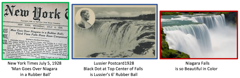 Instead of a barrel plunge, our subject daredevil, Lussier, had designed and had constructed a rubber ball with a 6’ diameter. The operation took place in Akron, Ohio, at the Akron Rubber Company. The 6′ ball was flexed internally by steel springs and lined with oxygen tubes. It cost him $1500 of his own savings, and as his story grew with nationwide coverage, he also upped the cost and said the stunt cost him $7000.